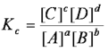 the ratio of product concentrations to reactant concentrations at equilibrium, with each concentration raised to a power equal to the number of moles of that substance in the balanced chemical equation. Commonly denoted by Kc, Kp, or Ksp