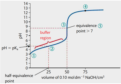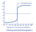 Equivalence point > 7. Curve ends at the pH of the strong base.