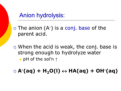 when the anion of a weak acid reacts with water to make a weakly basic solution